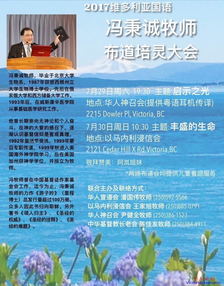2017维多利亚国语·冯秉诚牧师布道培灵大会将于7月29日、30日在维多利亚举行,欢迎弟兄姐妹、慕道友前来!