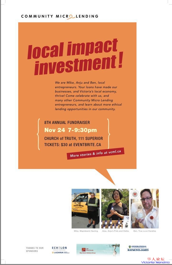 2017年度VCMLS慈善拍卖晚会Victoria Community Micro-Lending Annual Fundraiser, 将于11月24日在Church of Truth(渔人码头附近)举办,感谢我们的捐助方,照亮我们的企业家,为我们的组织筹集资金。我们也很高兴能与客座发言人希瑟·哈奇吉安一起来强调投资的影响。她是目标资本(一家投资影响咨询公司)的高级顾问,也是卡尔顿社区创新中心的研究人员。晚会将提供清淡的开胃菜,现金酒吧和各类拍卖物品。6 `6 c! Q0 Y* P7 ]7 u9 M/ ?