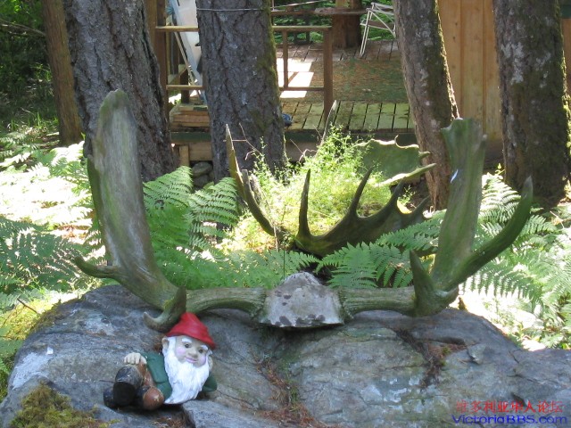 在我婆婆家的花园里有三只野生麋鹿角,这些都是很早以前我公公在Hope Mountain Region打猎时留下的,最早的一只可以追述到1992年,最大的一只据我婆婆说有2米多高,1100多磅,皮毛送给了当地人.现在只剩下这三只鹿角了.经过了这么多年的风吹雨淋依然完好,最近我发现有些鸟喜欢上了它,啄掉了鹿角的尖,我不知道如何去保护这些鹿角.