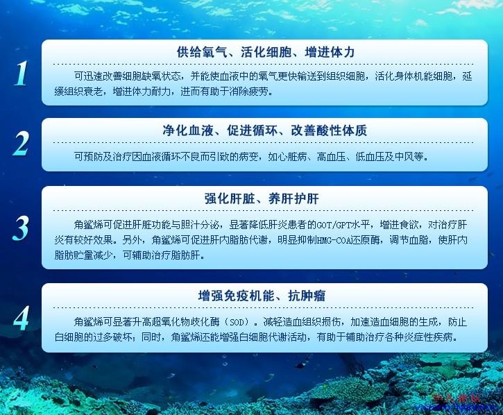 鲨鱼肝油中的角鲨烯在新陈代谢中可以生成氧气,从而提高血细胞的含氧量。很多生理学家认为人体之所以产生疾病是由于体内血细胞缺氧有关。想象一下,呆在一个封闭的屋子里,很快你就会感到头晕乏力。鲨鱼肝油可以提高细胞携带氧气的量,提供给人体各个器官充分的氧气,并把氧气运送到体内距离血管最遥远的细胞。最终角鲨烯将富集在人体皮肤,让皮肤充满活力,更加健康,让眼睛充满光泽。