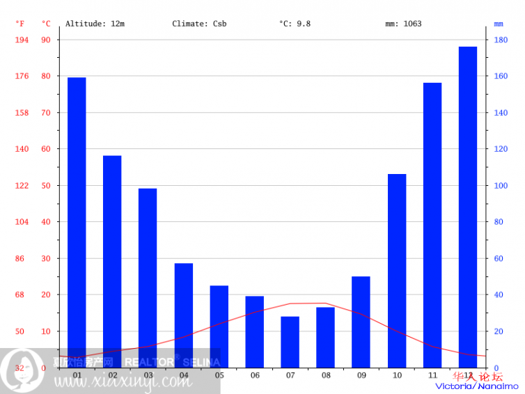 根据柯本气候分类法,该地区气候被归类为Csb。9.8 °C为 Nanaimo的全年平均气温。这个温度和温哥华Vancouver(年平均气温9.9°C)及