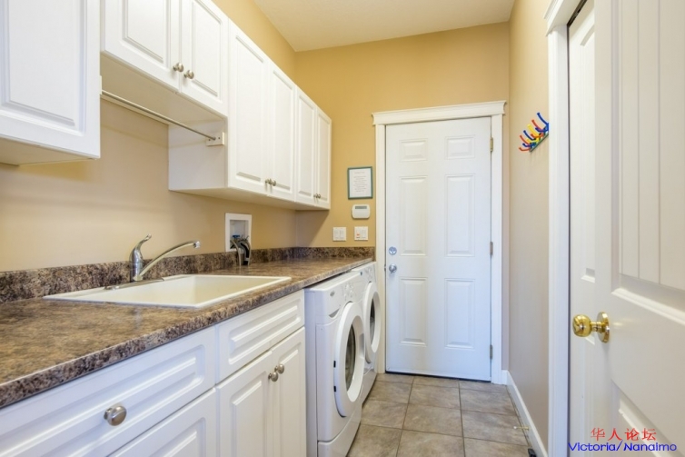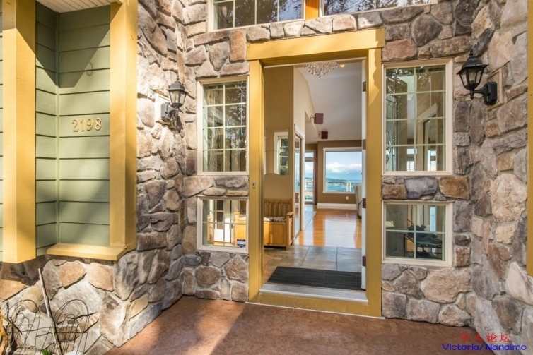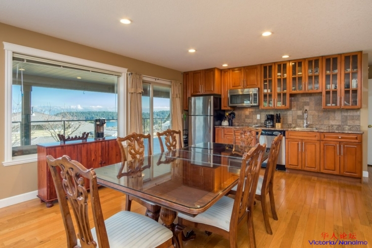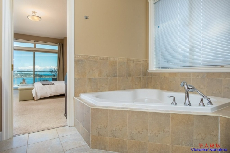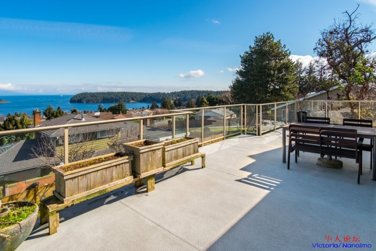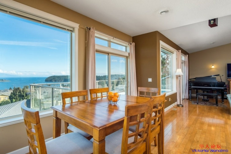 隔音材料,卫生间以及厨房地面采用地暖设计,以及开更大的窗户以及天窗,让更多的自然光线进入室内,等等。该房屋由于处于整个社区的最高处,每层都可以看到离湾(Departure Bay) 气象万千的动态海景。为了充分利用4300尺的建筑空间,屋主在首层安排了超大开放式的客厅和厨房/餐厅区,更有超大超宽的观景阳台,主卧也安排在靠海的一侧,使得主卧也可观海,宽敞明亮的5件套卫生间,如同置身五星级酒店。进门处的书房,既可以用于学习、办公,也可以