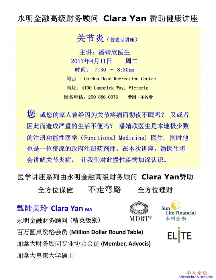 » 永明金融高级财务顾问 Clara Yan 赞助健康讲座-四月主题:关节炎