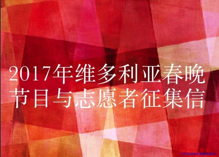 ; t: z3 w7 C2 a9 F# d" m, x       2017维多利亚春晚组委会愿与您一起为我们的华人社区和本地其他族裔的观众朋友们奉献一台精彩纷呈的晚会。不要让我们错过您的精彩,来和我们一起闪亮登场吧!0 V) y+ {5 E1 Q. s5 |