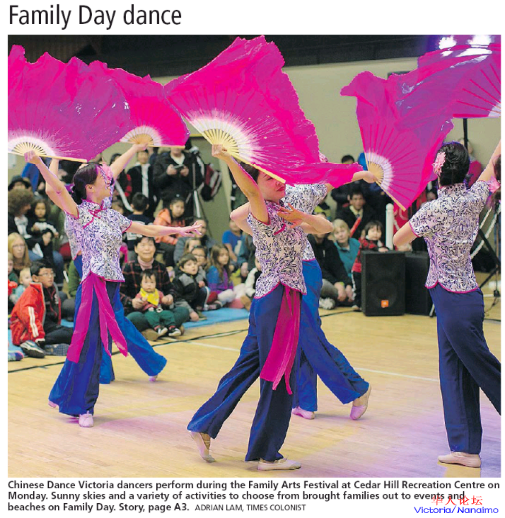 ( B) l6 {! f. [% R1 h家庭节那天, 维多利亚中华舞蹈团就来到雪松山社区娱乐中心, 参加本年次sannich 政府主办的"家庭艺术节"的表演。观众席上坐满了热情的,早早到来的观众。中华舞蹈团的节目把本次活动推向了高潮,获得了热烈的掌声, 为艺术节增添了亮点和色彩。: |: V" P7 i1 o
